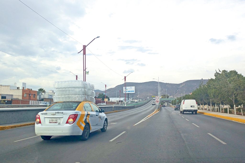 El conductor de este taxi metropolitano no le importo el Reglamento de Tránsito al portar sobre su toldo varias docenas de botas de plástico amarradas, poniendo en riesgo a los demás automovilistas y mucho menos que alguna autoridad de tránsito le interpusiera una multa.