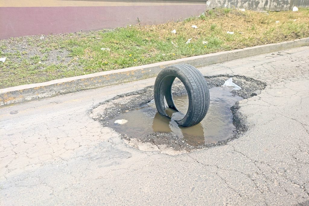 Para evitar algún incidente vial, vecinos y trabajadores de las oficinas del Sector Primario en Pachuca colocaron un neumático como aviso para evitar caer en un bache localizado en la lateral del bulevar Felipe Ángeles y automovilistas y peatones sepan del peligro.