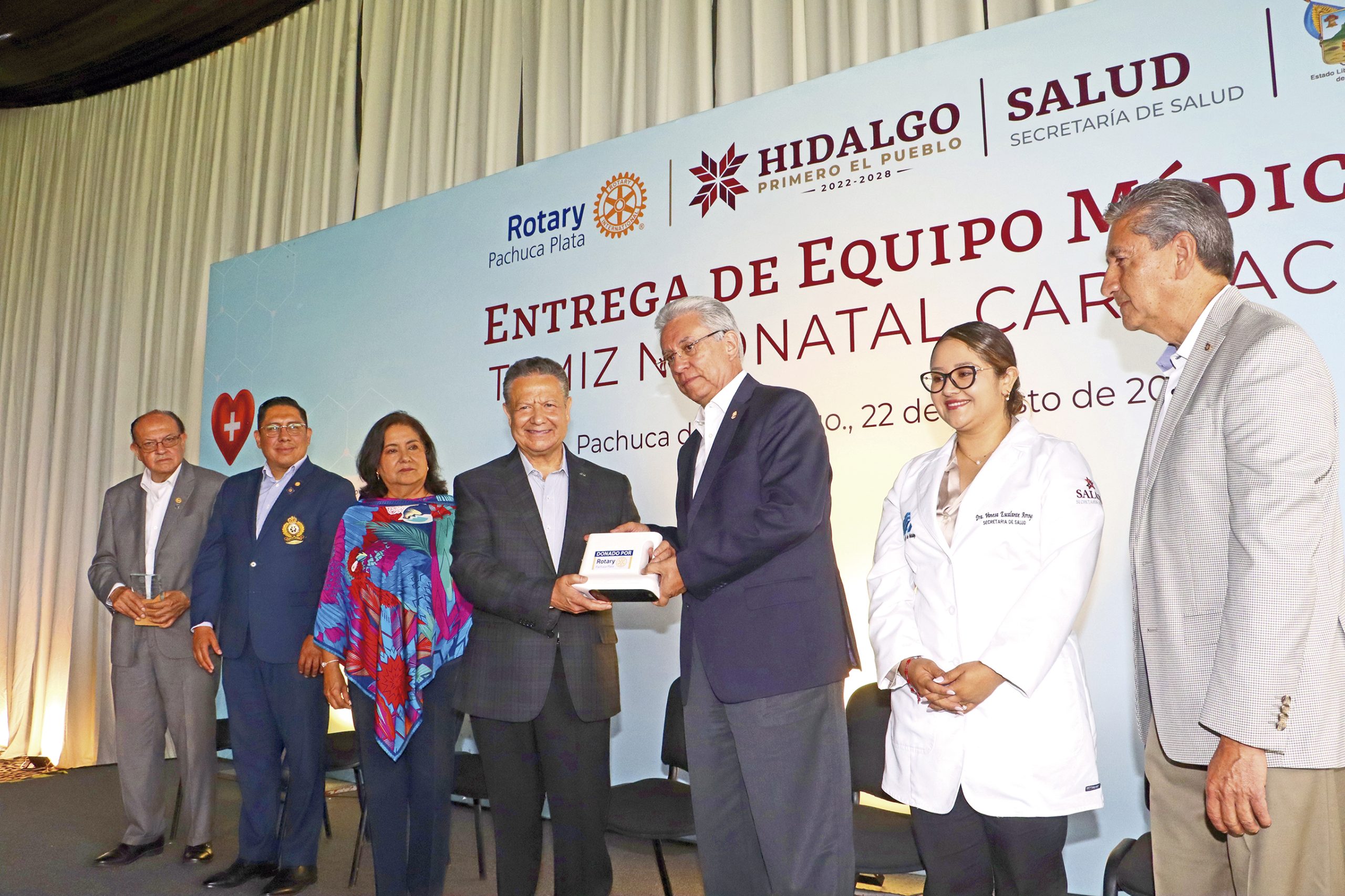 Como parte de las subvenciones que realizan, integrantes del Club Rotario Pachuca Plata entregaron al gobierno de Hidalgo 6 mil sensores y 17 oxímetros de alta tecnología para aplicar tamiz neonatal cardíaco a 100 mil recién nacidos de hospitales públicos.