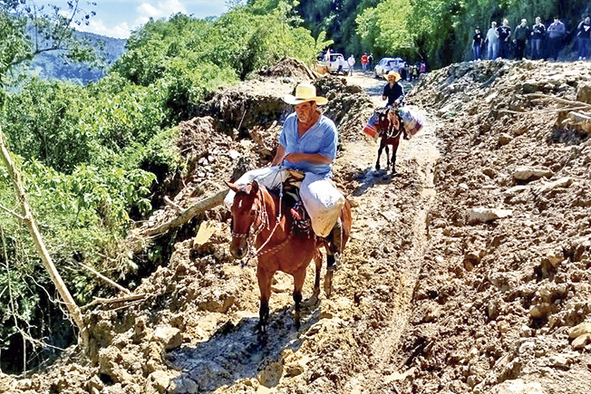 Con la finalidad de que ninguna familia afectada por las lluvias se quede sin víveres, personal de la Secretaría de Turismo del gobierno de Hidalgo, implementó el uso de caballos y mulas para entregar despensas en las comunidades de Acuautla, La Esperanza, Los Naranjos y San Antonio, todas del municipio de Huehuetla.